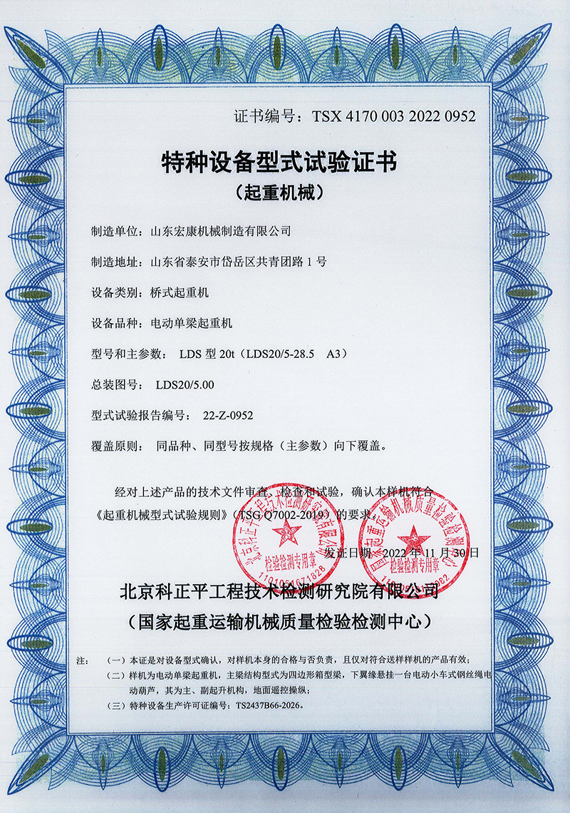 电动单梁桥式起重机型式试验合格证