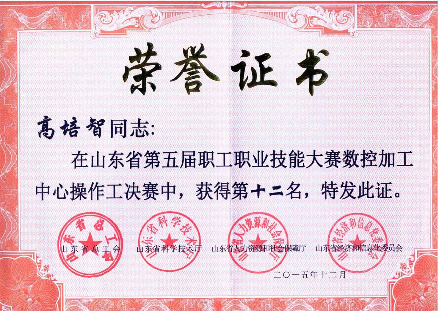 公司员工高培智在山东省第五届职工职业技能大赛数控加工中心操作工决赛中,获得第十二名,日前受到省总工会、省科技厅、省人力资源和社会保障厅和省经信委四部门联合表彰。